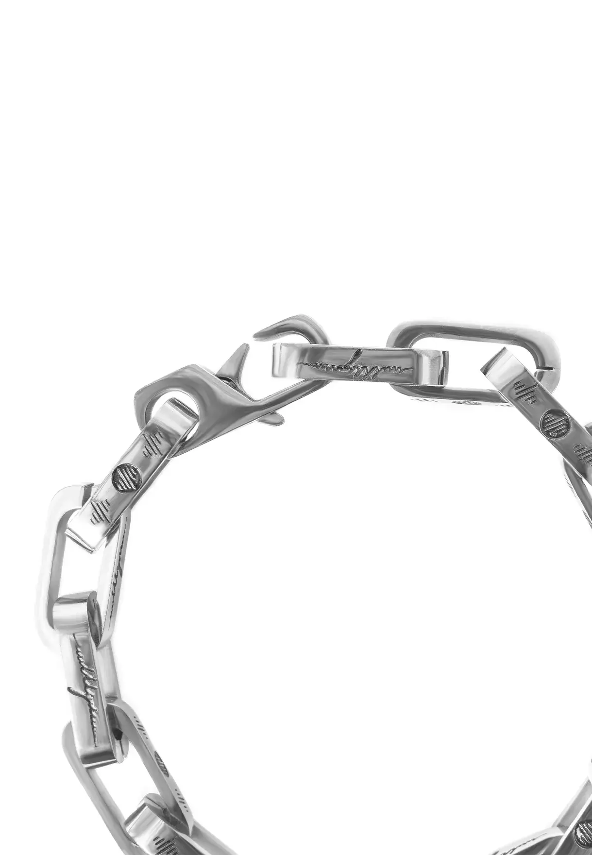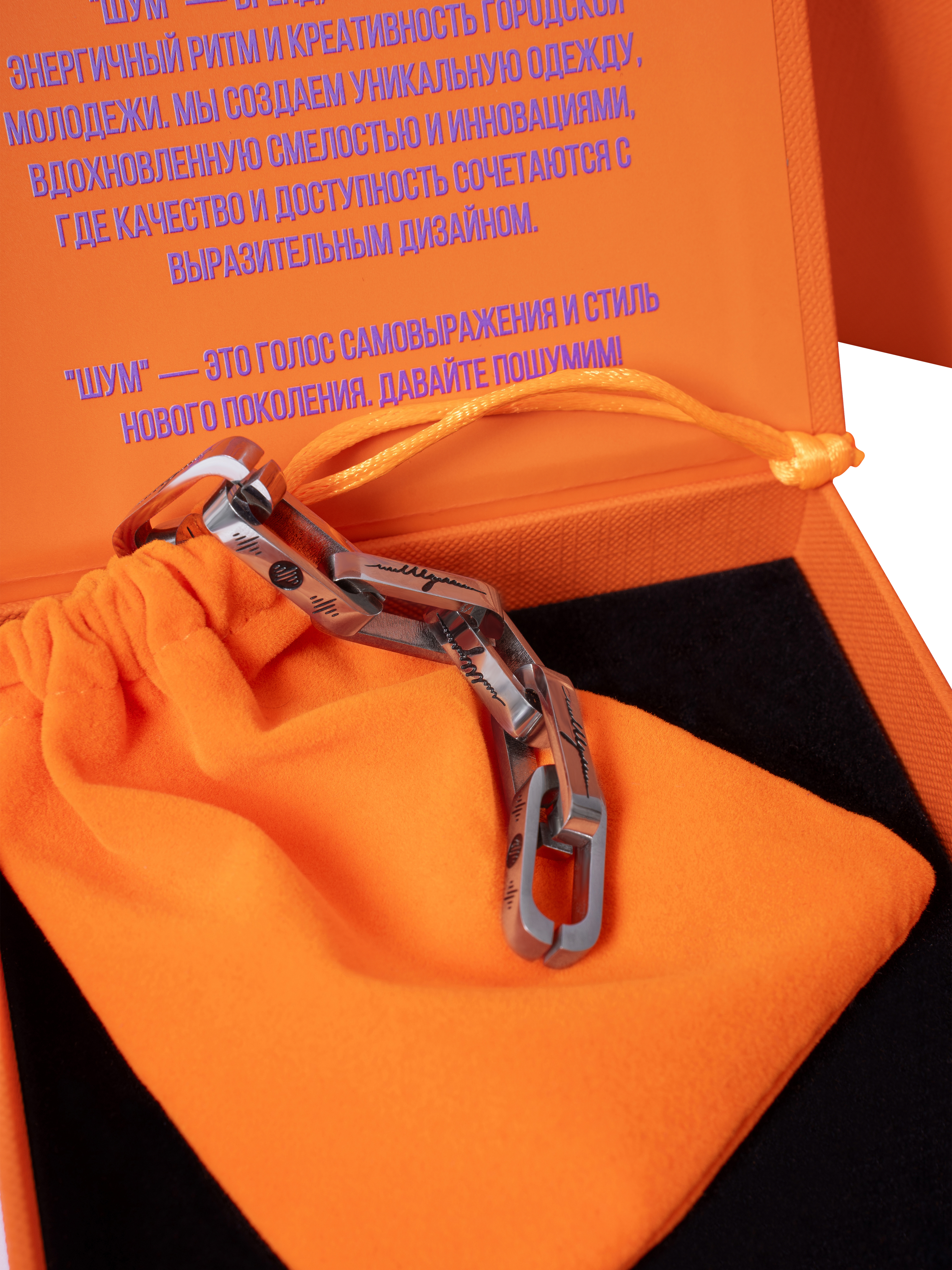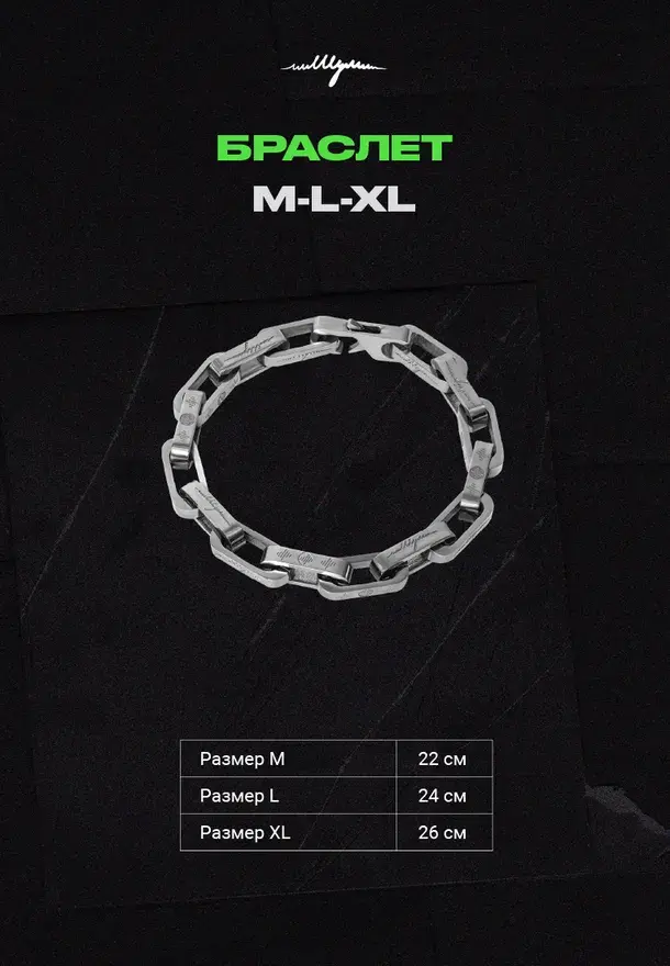 Изготовлен из премиальной нержавеющей стали с элегантной отделкой. Логотип ШУМ и фирменная монограмма выгравированы с ювелирной точностью, а затем заполнены черной глянцевой краской. Элементы гравировки выделяются глубоким черным цветом, создавая стильный контраст на поверхности браслета. Эргономичная форма обеспечивает комфорт при ежедневной носке.