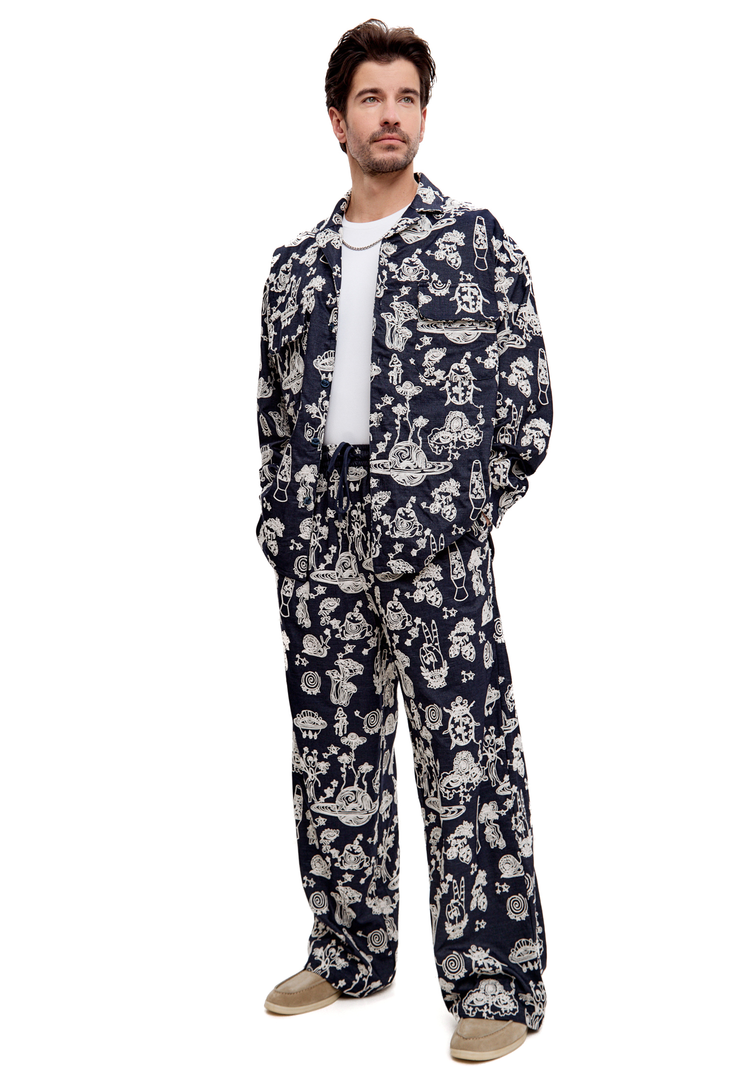 Брюки имеют пару — рубашку ШУМ САТУРНА с идентичной вышивкой. Вместе они составляют полноценный костюм для тех, кто готов заявить о себе на все сто.