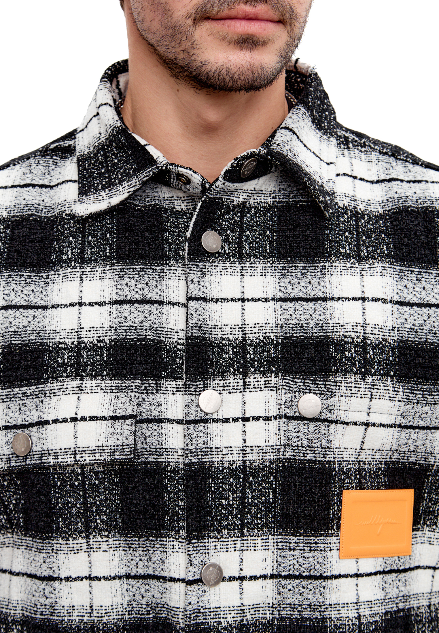 Металлические клёпки цвета антрацит с лазерной гравировкой логотипа ШУМ. Два накладных кармана на груди с клапанами для мелочей. Внутренний карман размером 14х23 см на застёжке вмещает документы и смартфон. Кожаная оранжевая нашивка на левом кармане и жаккардовая оранжевая бирка на спинке снизу подчёркивают принадлежность к движению.